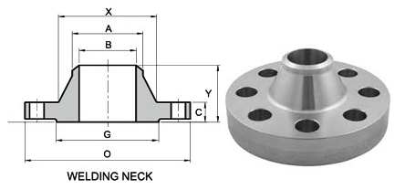 | Pipe NPS (inch) | Pipe DN (mm) | O.D. Flange (O) | Thk. of Flange Min (C) | Diam. of Hub (X) | Diam. of Raised Face (G) | Hub Diam. Chamfer (A) | Length Hub (Y) | Diam. of Bolt Circle (BC) | Diam. of Bolt Holes (BH) | Number of Bolts (BN) | Diam. of Bolts (inch) (BD) | Approx. Weight (KG/PCS) | Approx. Weight (LB/PCS) |